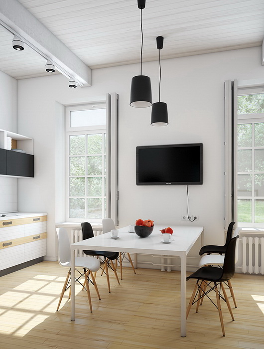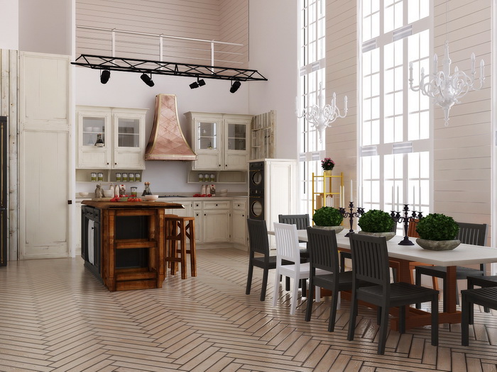 Основу интерьеру задает отделка из натуральных материалов: деревянные полы, побеленной потолок, светлые отштукатуренные стены или обклеенные обоями.