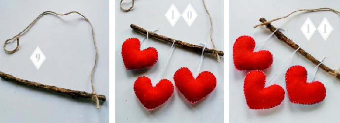 К готовым сердечкам пришиваем ниточки для подвешивания.