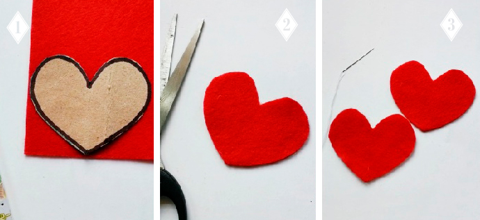 Прикладываем к красному фетру шаблон сердца (шаблон представлен ниже, можете распечатать или перерисовать), обводим по контуру, вырезаем. Для одного сердца понадобится две идентичных детали.