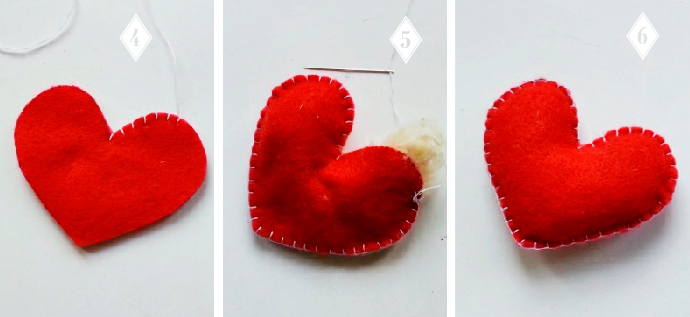 Накрываем  первым фетровым сердцем другое сердечко и сшиваем обметочным швом. Когда сердце будет почти полностью прошито, заполняем его синтепоном, и зашиваем до конца.