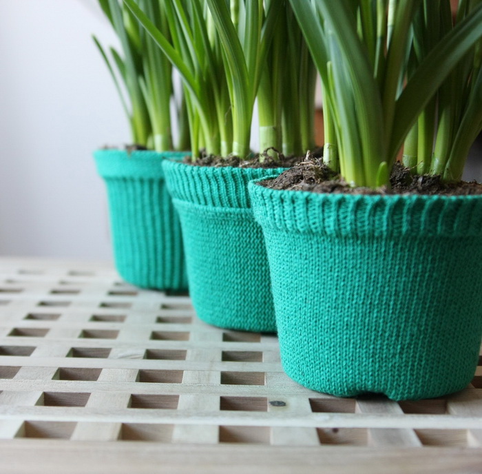 Сейчас очень популярен вязаный декор, чашки, чайники обзавелись вязаными чехлами, абажуры светильников, чехлы на пуфы и кресла тоже вяжут на спицах. Наверняка, в Вашем гардеробе есть любимые свитера и пуловеры, с которыми жаль расстаться, но и носить их уже нельзя. Можно продлить им жизнь, сделав из них декор на цветочный горшок.