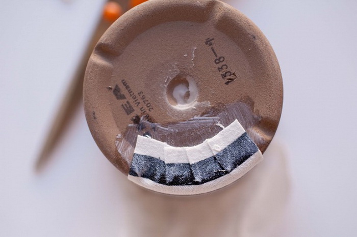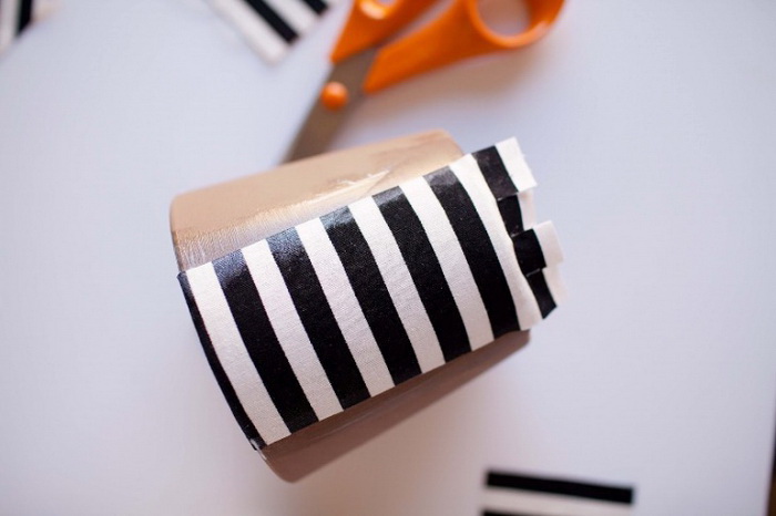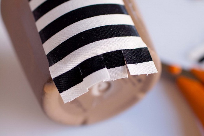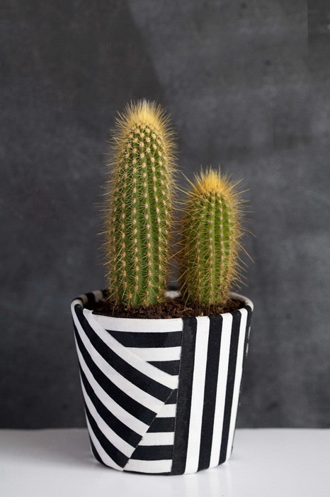 С помощью полосатой чёрно-белой ткани сделаем декор нашего кашпо нетривиальным – это второй пример.