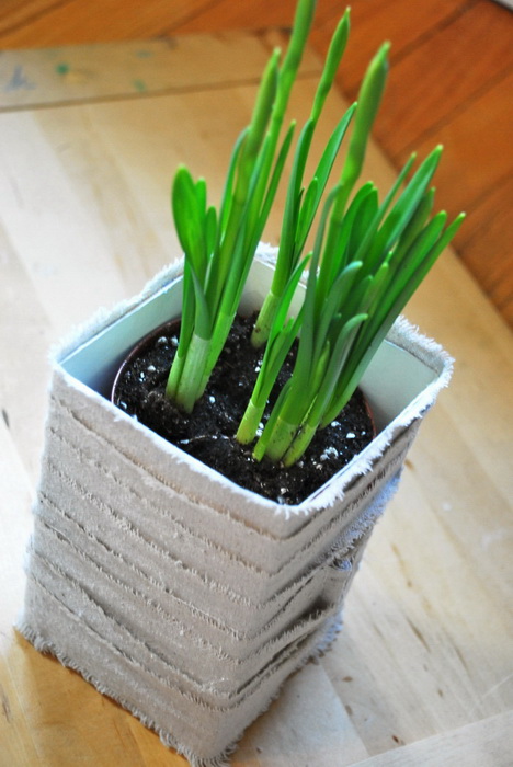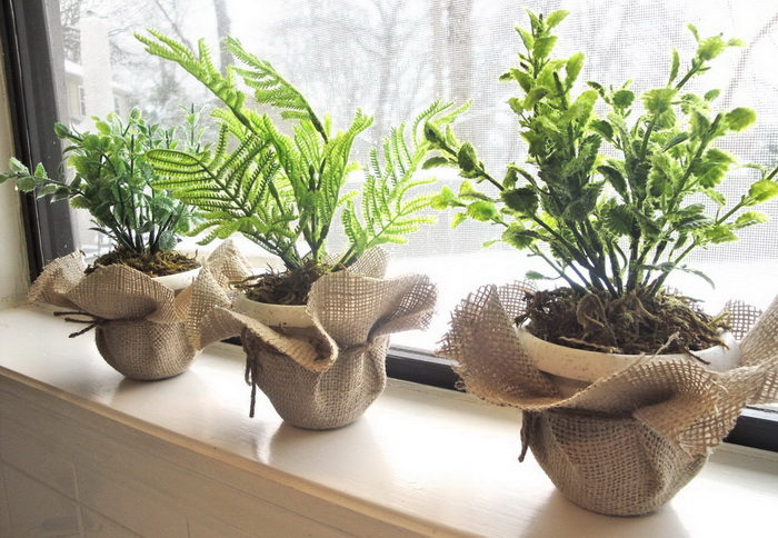 Согласитесь, разномастные цветочные кашпо, стоящие на окне, производят впечатление неаккуратности и захламлённости. Самый простой способ сделать их репрезентативными и стильными, обернуть тканью типа рогожки или мешковины, подвязав тесьмой или шпагатом. Свежая зелень приятно гармонирует с натуральными материалами. Такая «одёжка» для цветочных горшков легко меняется. К Рождеству или Пасхе, например, у Вас будет особый оригинальный декор окна.