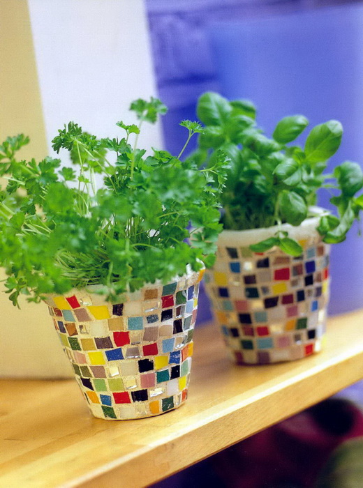 Пластиковое ведёрко или жестяную коробку можно спрятать за обычной галькой. Плотно друг к другу, с помощью клеевого пистолета наклеиваем камушек за камушком на всю поверхность. Такое кашпо будет живописно смотреться и на дачной дорожке, и на балконе.