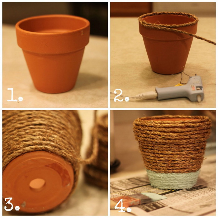 Примитивные жестяные коробки или пластиковые цветочные горшки можно преобразить до не узнаваемости. В первом случае с помощью шпагата и клея сделаем наши «горшочки» для цветов привлекательными.