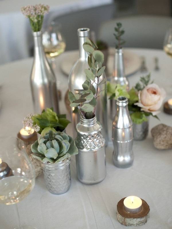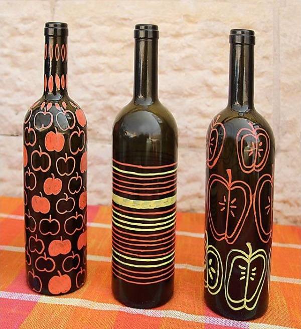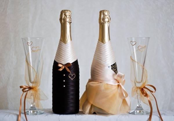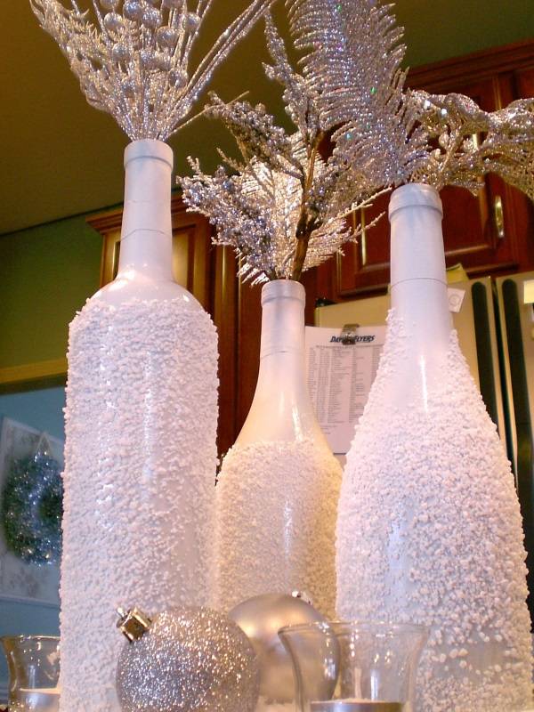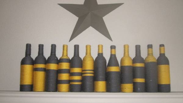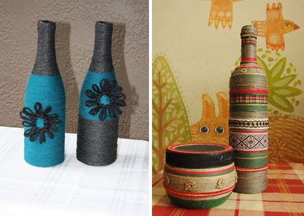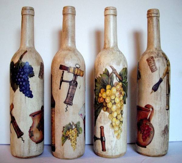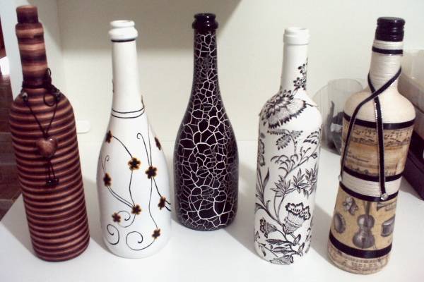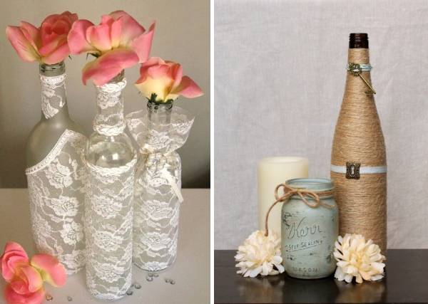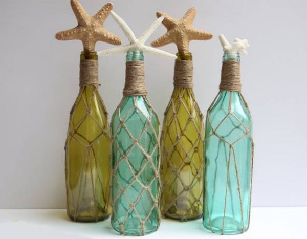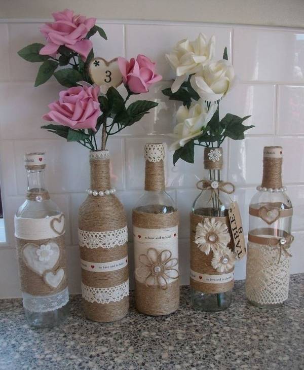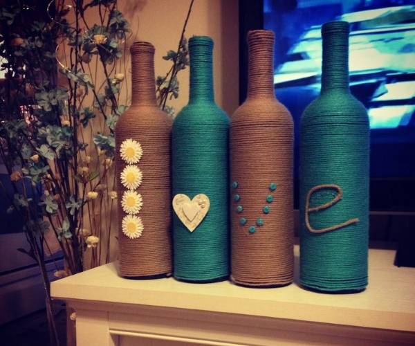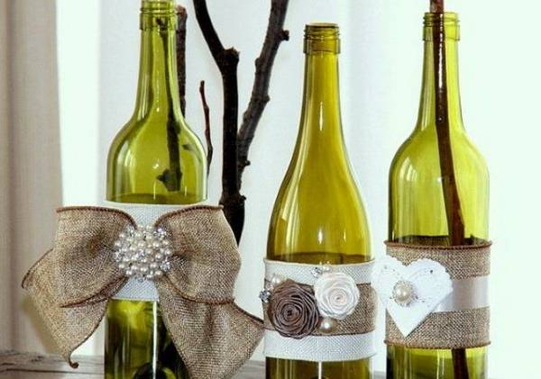 Ниже мы представляем вам 50 фото, на которых показано декорирование бутылок своими руками, в том числе: