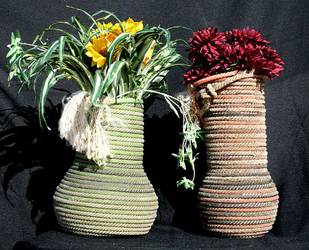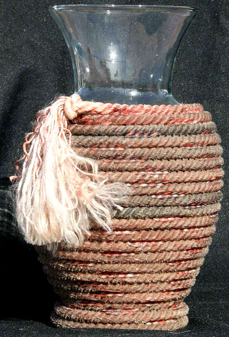 2. Далее, можно обмотать веревкой стеклянные вазы, которые просто прекрасно впишутся в экзотические интерьеры: марокканский, индийский или японский. Причем вазы могут быть высокими — для цветов, низкими — для мелочи или ключей, средними — для банных, личных принадлежностей.