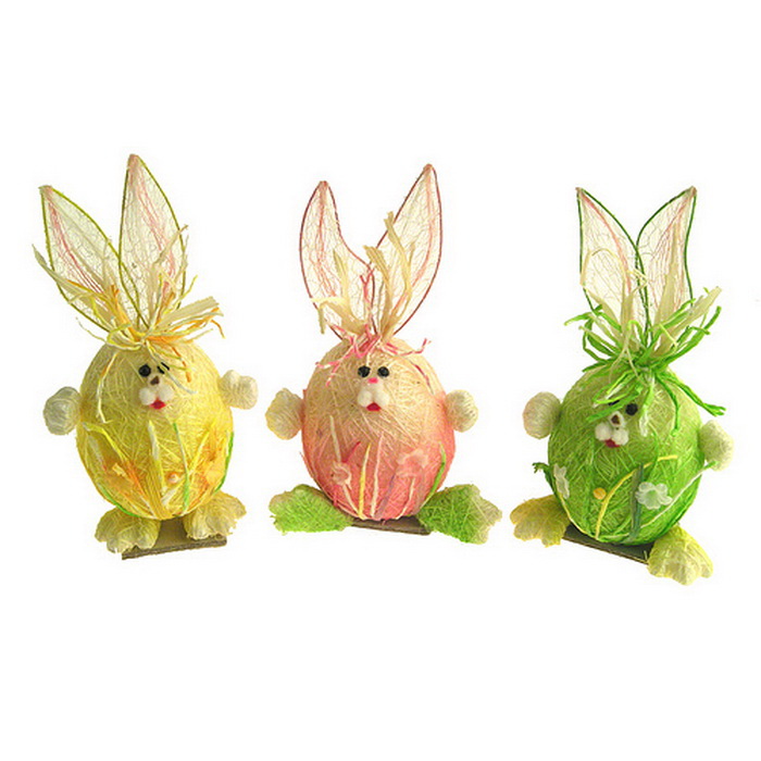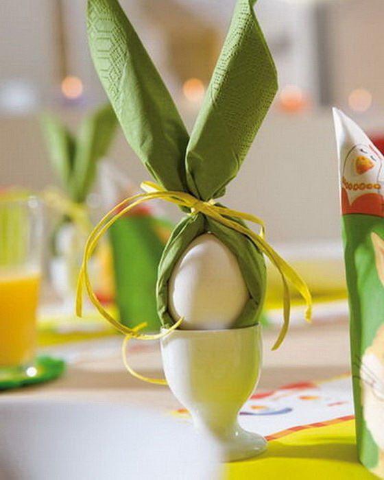 Вот уж совсем простой вариант, но не менее привлекательный. Салфетка (любая: тканевая, бумажная) складывается по диагонали и сворачивается в трубочку или складывается в полоску (кому как понравится). Оборачивается вокруг яйца и завязывается сверху тесёмкой, ленточкой. Ушки готовы. Получился симпатичный зайка.