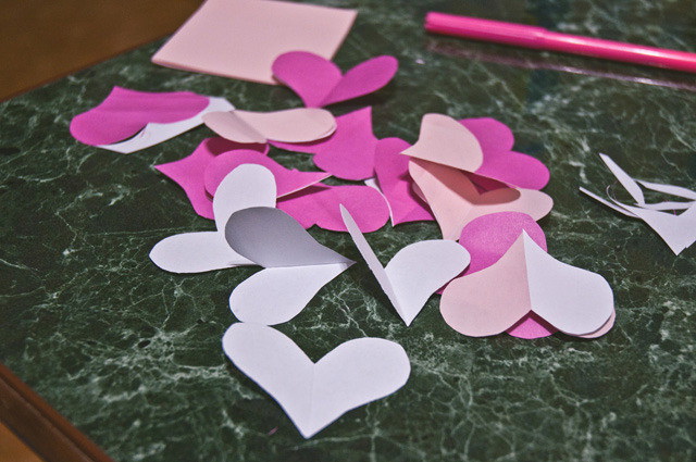 2. Экспериментируйте не только с материалом, но с формой и цветом. На белые сердечки можете наклеить небольшие кусочки ткани, разрисовать более мелкими сердечками или написать поздравления и покрыть блёстками.