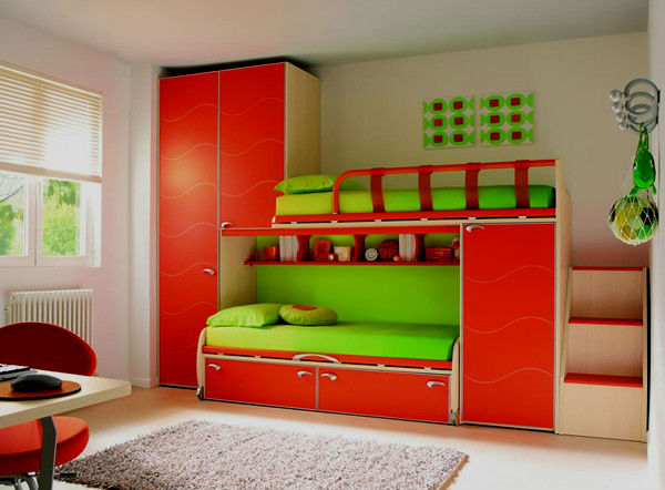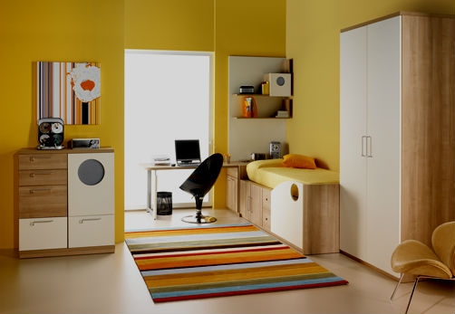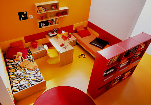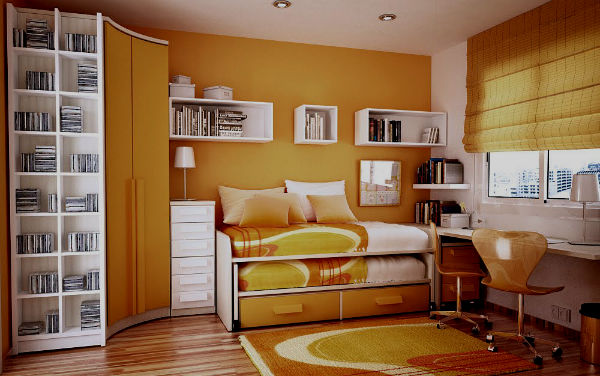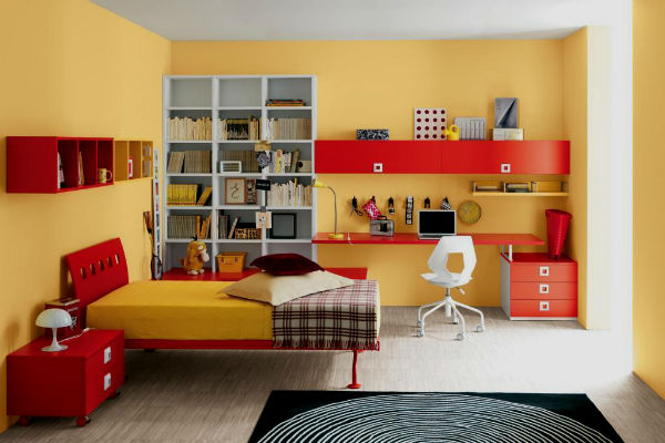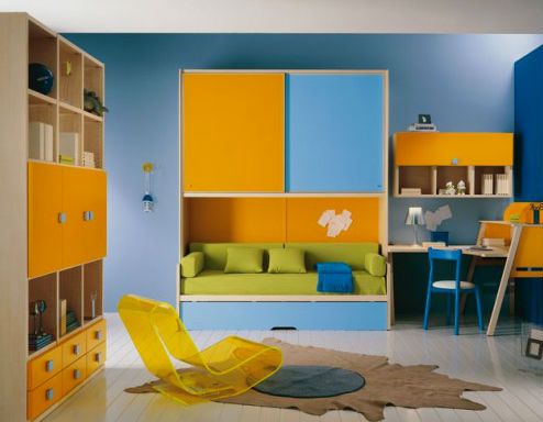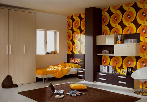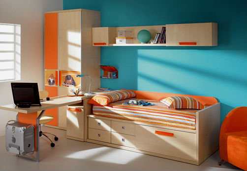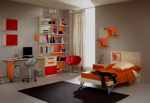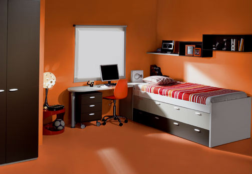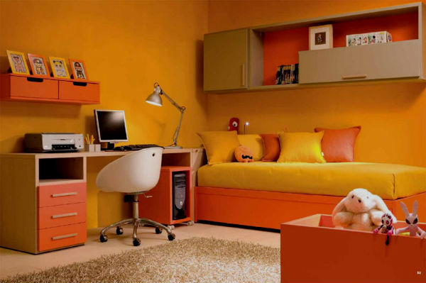 • Очень эффектно смотрится оранжевая мебель (кровать, шкаф, стол) с желтыми или зелеными вставками, а также текстилем. Но в таком случае оттенок стен должен быть максимально нейтральным, а именно серым или бежевым.