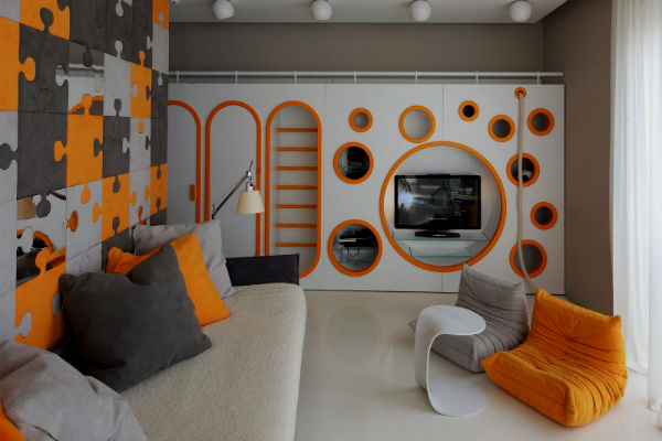 • В чистом своем воплощении оранжевый цвет смотрится излишне вызывающе, поэтому его лучше разбавлять какими-то менее активными оттенками. К примеру, оранжевая мебель должна размещаться на фоне серых, белых или бежевых стен. Кстати вариант с серыми стенами считается одним из самых правильных, так как серая палитра способна контролировать и поглощать яркость оранжевого тона.