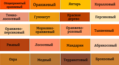 Наверное, все знают, что у каждого основного цвета есть множество оттенков, которые могут быть ярче, бледнее, светлее или темнее. Ниже, на фото можете изучить вариации оранжевого цвета, начиная от яркого истинно оранжевого тона и заканчивая приглушенной охрой или бронзой.