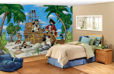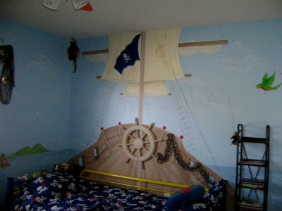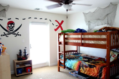 Стены в пиратской детской комнате можно дополнительно декорировать, картинами с изображениями кораблей, стикерами (с пиратским флагом, пиратами, пальмами), спасательными кругами, большой картой сокровищ, сетью, парусами, всевозможными канатами, часами — штурвалом, флагами с изображением веселого Роджера, перекрещенными пистолетами, шпагами, шляпами и банданами. Окно можно интересно оформить темными шторами, которые будут изображать паруса, их можно повязать простой веревкой или лентой из мешковины.