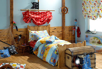 Мебель в таком помещении играет немаловажную роль, дело в том, что сейчас в продаже представлены дизайнерские кровати в форме шлюпки или целого корабля. Но такая мебель и стоить будет соответствующе, поэтому можно приобрести альтернативную, простую деревянную кровать, чем-то похожую на места отдыха в каютах пиратов. Чтобы кровать удачно вписалась в интерьер, у ее основания можно закрепить пиратский флаг.