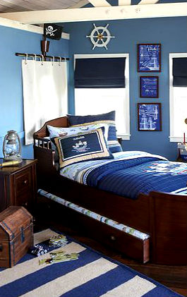 Детская комната в пиратском стиле, должна оформляться в сине-коричнево-черно-белых тонах, и обязательно разбавляться несколькими более яркими цветами, к примеру: красным, оранжевым или желтым.
