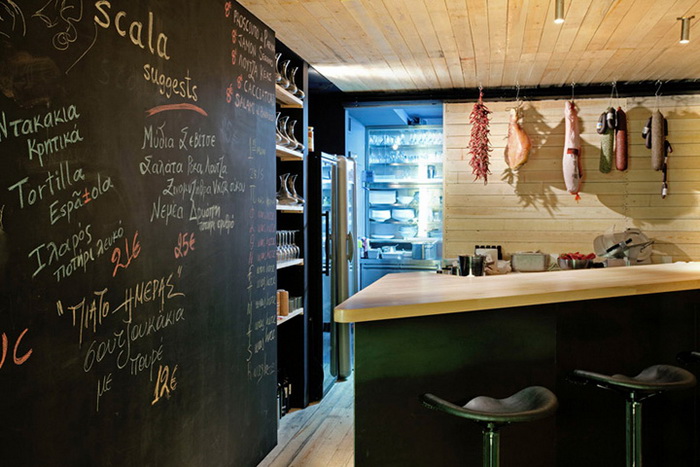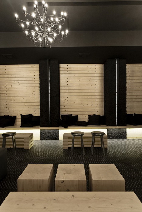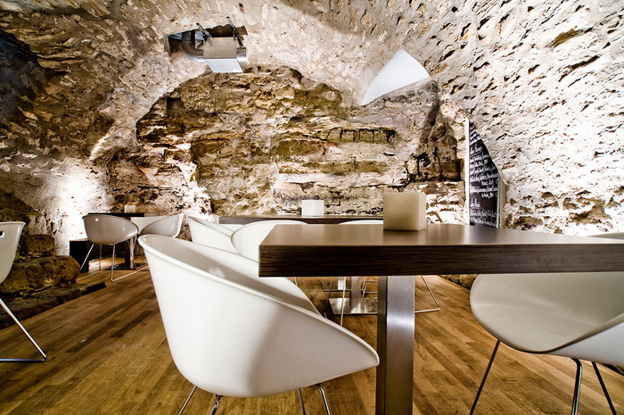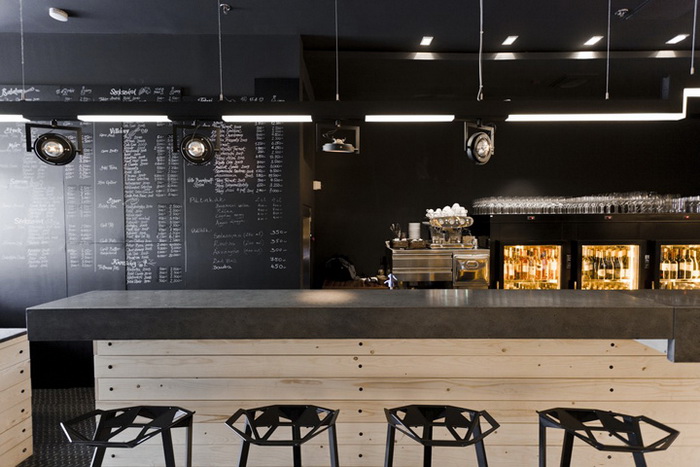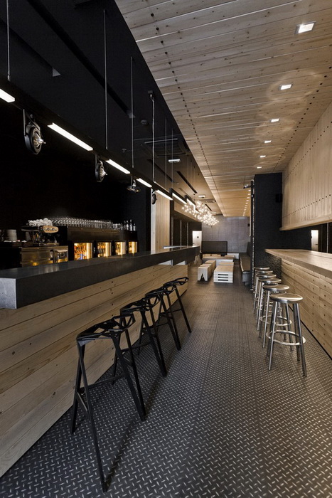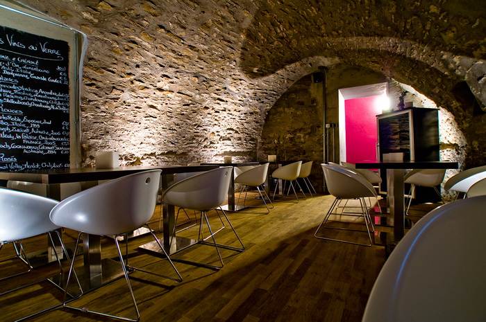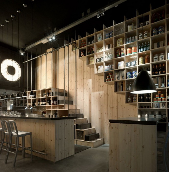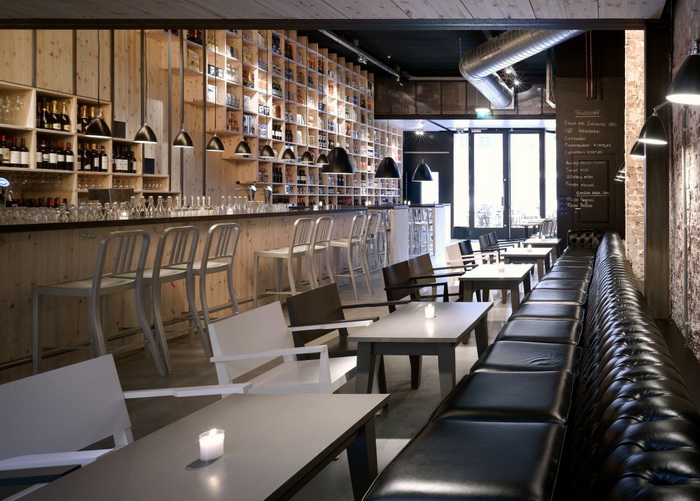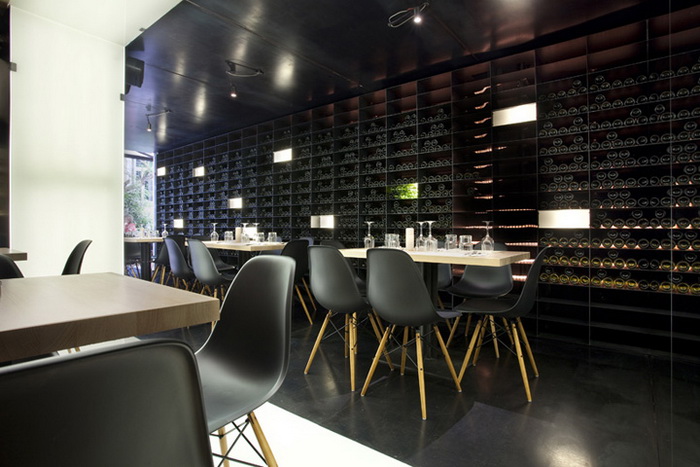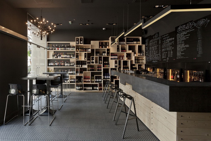 Дизайнер создал игру контрастов, соединив классическую кирпичную кладку и современную мебель. Оформление интерьера в 2 цвета: черный цвет камня и светлый цвет дерева. Здесь щедро используются вставки из сосны: настенное покрытие, барная стойка, часть винных стоек. Создатели винотеки сохранили аутентичный вид помещения, куда отлично вписались грифельные доски с меню и ряды бокалов. Основная особенность планировки состоит в узких длинных. Освещение заведения приглушенное, так достигается ощущение уюта и спокойствия. В оформлении использованы преимущественно натуральные, спокойные цвета и оттенки.
