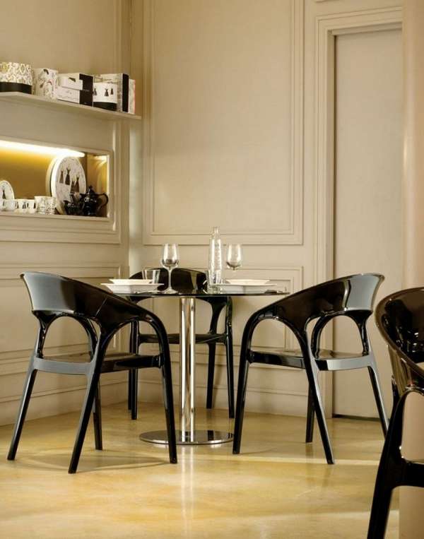 Надежные и легкие дизайнерские пластиковые стулья отличаются своими плавными линиями, матовым блеском и простотой ухода. Благодаря последнему фактору, их часто можно встретить на кухнях. Пластик имеет богатую палитру оттенков, и в этом его главный плюс. Небольшие помещения, как правило, оформляются в светлых однотонных тонах и требуют наличия акцентных элементов. Таковыми, например, станут дизайнерские пластиковые стулья для кухни желтого, зеленого, черного цветов. Уместными здесь станут раскладные конструкции, которые, как уже упоминалось ранее, помогут освободить пространство.