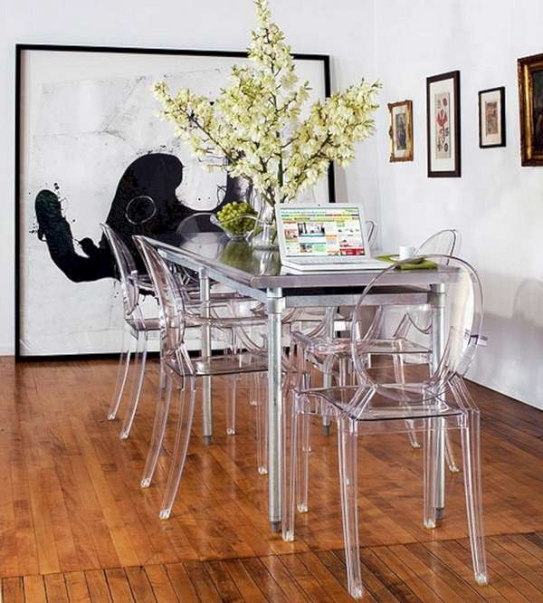 Мебель из стекла и пластика стала пользоваться популярностью, начиная с 70-х годов прошлого века, когда в интерьерах начало развиваться минималистическое направление. Прозрачные дизайнерские стулья придают помещению стильность и выразительность, они остаются, практически, незаметными в интерьере, создавая атмосферу простора. Их применение особенно удачно в скандинавском, авангардном стиле, а для ультрасовременного направления хай-тек лучшего варианта не подыскать.