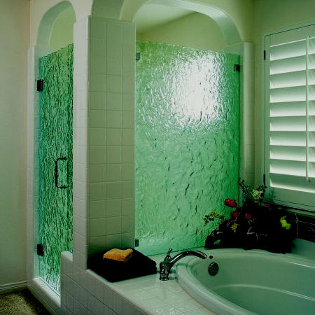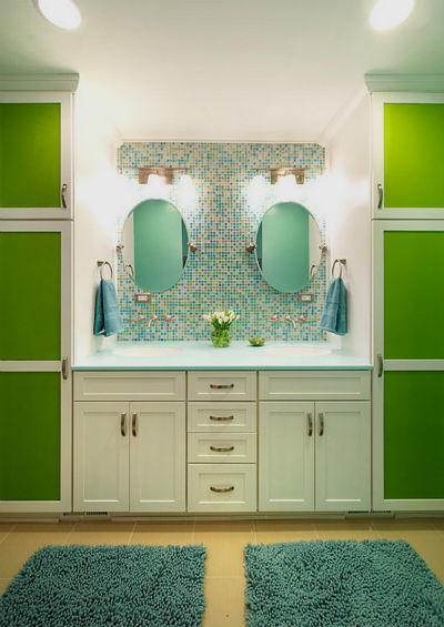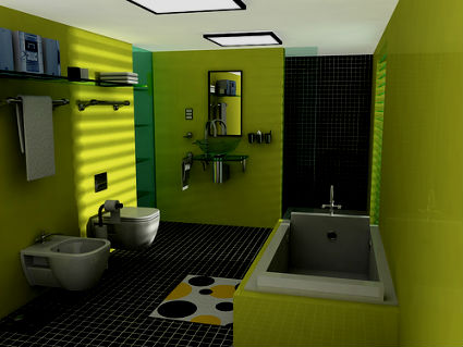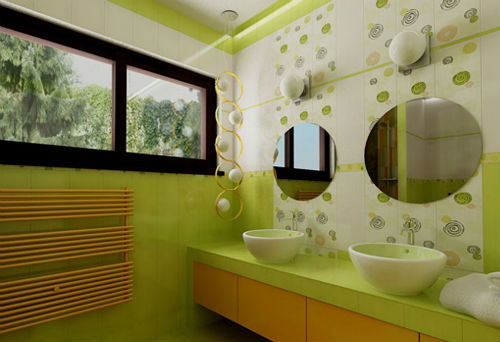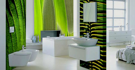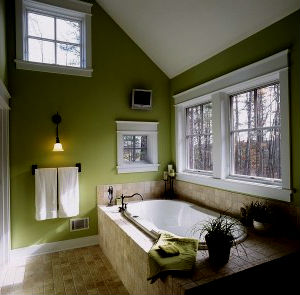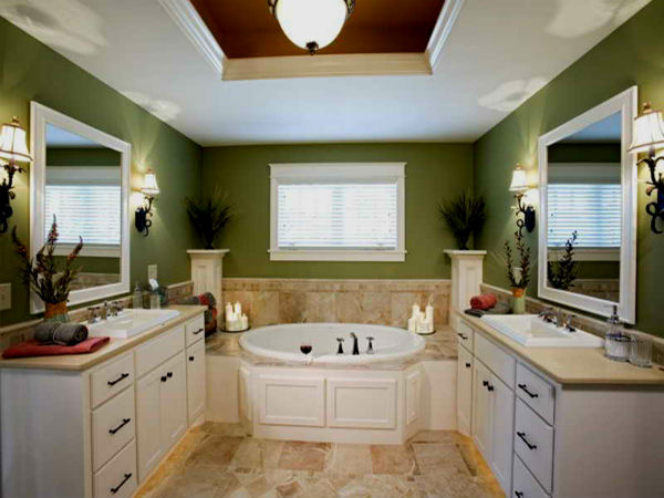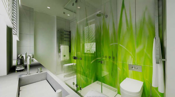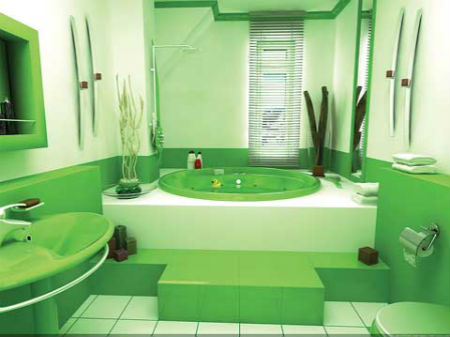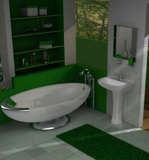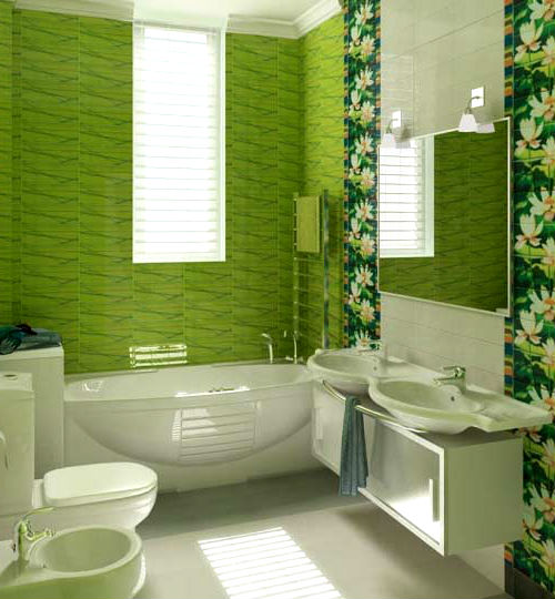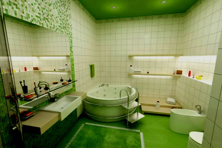 Ванная в зеленых тонах может быть дополнена круглым подиумом, покрытым ковролином с высоким ворсом, имитирующим свежую траву, который в сочетании с квадратной ванной будет смотреться как нельзя лучше. Кроме того ванная комната, конечно же просто не может обойтись без комфортной душевой кабины с гидромассажем. Несущие стенки которой, должны быть изготовлены в едином дизайне с ванной и умывальником.