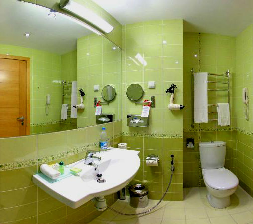 Если рассматривать сопутствующую мебель, то в ванной комнате принято располагать тумбу для раковины, корзины для белья, из бытовой техники – стиральную машину и сушильную машину. Нередко в ванной располагают настенный сушитель для белья, на котором можно сушить душевые полотенца. Также по стенам располагают вешалки для халатов, банных полотенец и полотенец для рук. Здесь хотелось бы заметить, что подобные предметы должны соответствовать определенной гамме, к примеру серебристой, золотистой или бронзовой. Допустим, за основу взят бронзовый оттенок, значит водопроводные краны, мусорное ведро, различные полочки и держатели должны быть выполнены в данной гамме. Кстати, зеленую палитру можно смело сочетать, как с серебристыми тонами, так золотыми и бронзовыми.
