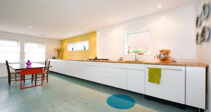 Достоинство длинной кухни в том, что есть возможность разместить ящики и шкафы по обеим сторонам. Решение сделать много ящиков и шкафчиков, делает дизайн длинной кухни, функциональным и привлекательным. Многие думают, что, сколько шкафов не сделай, все равно будет мало. Но перед тем как делать кухню, задумайтесь, не будет ли многовато, восемь или десять шкафчиков и тумбочек.