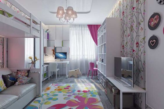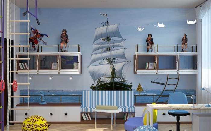 Оформление во многом зависит от предпочтений самого ребенка, с которыми нужно считаться, чтобы чадо чувствовало себя комфортно. Часто дизайн интерьера детской комнаты двухкомнатной квартиры оформляют с использованием любимых мультяшных или сказочных персонажей. Здесь в помощь придут фотообои, мягкие игрушки, а также тематическое постельное белье. При оформлении комнаты для подростка, обязательно необходимо учесть его пожелания и увлечения. Интерьер вполне может быть оформлен с элементами любимого вида спорта или в музыкальном направлении. Морская тематика также пользуется популярностью.