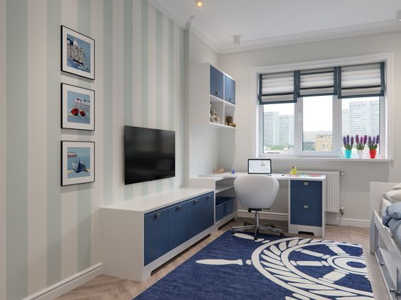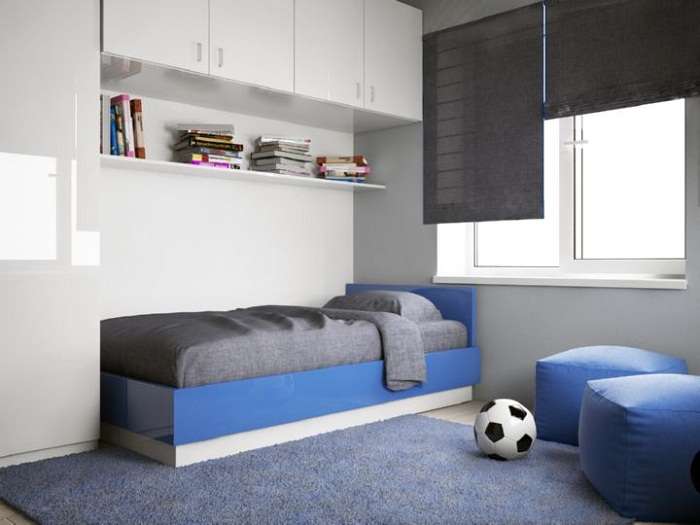 Школьник будет нуждаться уже в дополнительных элементах мебели, которыми выступают письменный стол (как вариант, компьютерный стол), полки для книг, да и маленьким шкафчиком уже не обойтись — можно приобрести небольшой шкаф-купе, где разместится вся одежда и обувь подрастающего хозяина комнаты. Иногда дизайнерами применяется такое решение, как встроенная мебель, например шкаф-кровать, что значительно освободит пространство в дневное время суток или при посещении гостей.