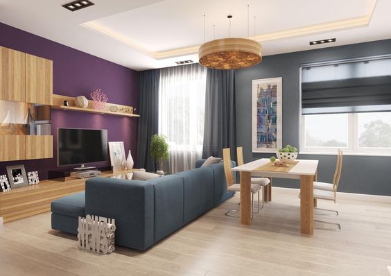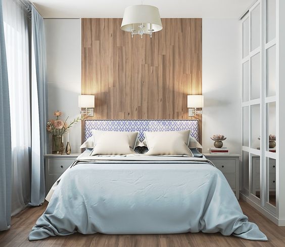 Лучшими цветами станут зеленый, бежевый, синий и их всевозможные оттенки. Такая палитра придаст помещению одновременно простор и уют домашнего очага. Для отделки стен подойдут такие материалы как обои или декоративная штукатурка, при чем оба варианта могут быть как однотонными, так и иметь определенные рельефы и рисунки. Стоит учесть, что разное расположение геометрических линий на стенах может привнести тот или иной визуальный эффект.