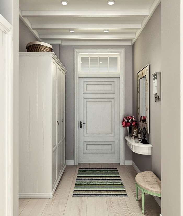 Если члены семьи сошлись во мнении, что прихожая все-таки необходима, значит нужно продумать ее интерьер. В первую очередь — это цвет. Если мы говорим про дизайн малогабаритной двухкомнатной квартиры — коридор здесь также будет небольшим, а значит, его предпочтительно оформлять в светлых тонах, так как темные значительно уменьшат и без того маленькое пространство.