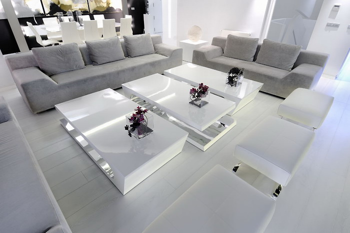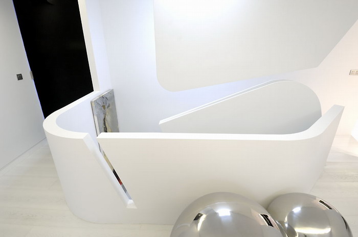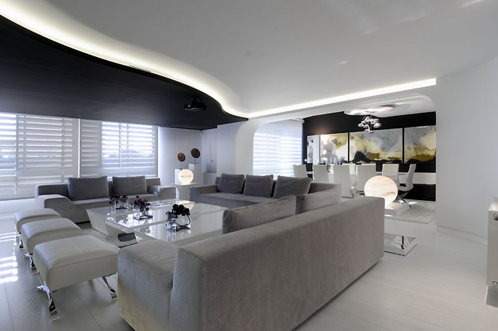 В интерьере преобладает белый цвет, и лишь некоторые элементы, словно встряска, пробуждают нас, бросаются в глаза за счет контрастной черной окраски и синей подсветки.