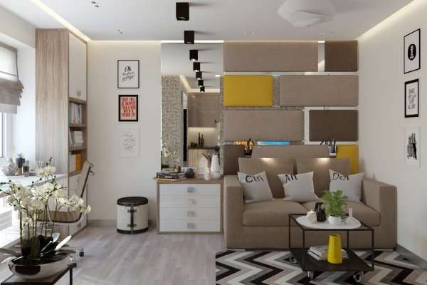 Чтобы разделить интерьер однокомнатной квартиры на функциональные зоны, необязательно использовать стены или гипсокартонные перегородки. Вышеупомянутая мебель-трансформер позволит гостиной одновременно выступать в роли спальни.