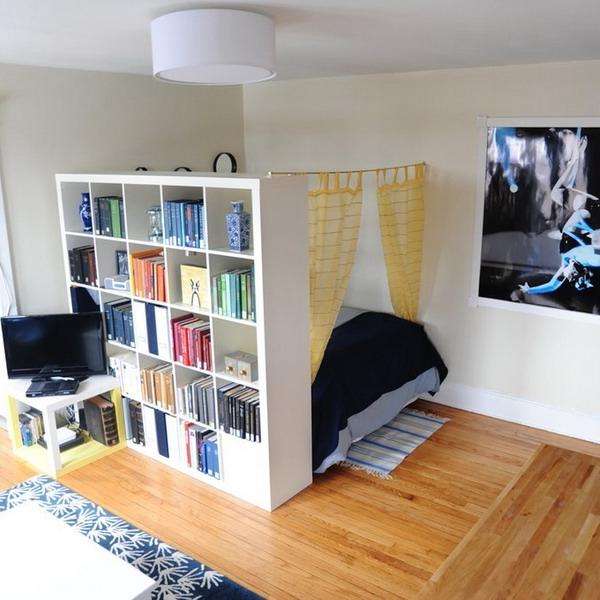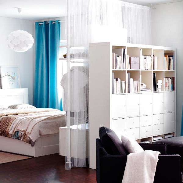 Напольные полки и шкафы могут пригодиться, когда нужно отделить детскую зону, домашний офис или спальное место. Впрочем, с этой ролью отлично справятся и комнатные занавески.