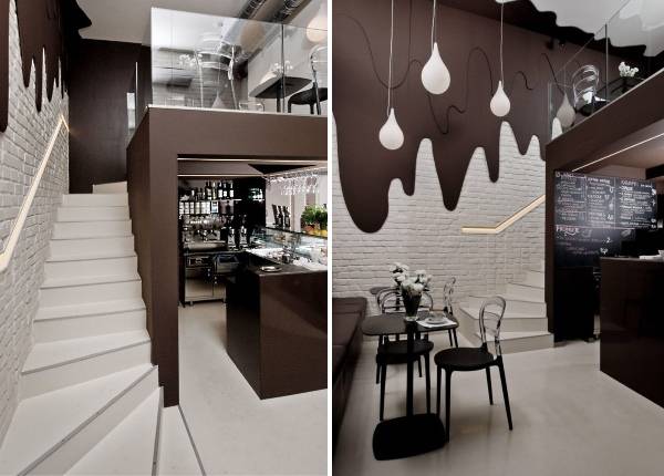 Схожий пример такого хитрого дизайнерского подхода можно увидеть в польском кафе Chocolate Bar, город Ополе. Достаточно взглянуть на фото интерьера, чтобы срочно захотеть порцию горячего шоколада.