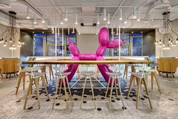 Яркая скульптура в стиле Джеффа Кунса занимает центральное место в этом шикарном киевском кафе. Соблазняющий отведать французские кондитерские изделия, интерьер кафе The Cake выглядит так, будто его самого можно употребить в пищу. Чего только стоит дизайн и цвет стен!