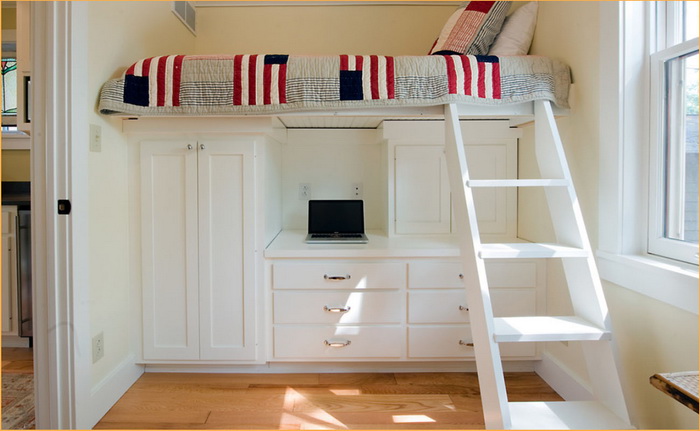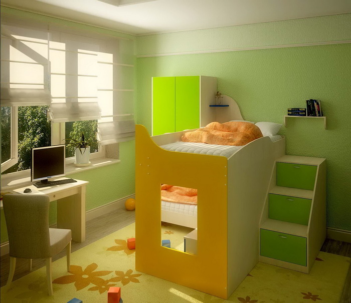 • Важный параметр которым должна обладать мебель в маленькой детской комнате – механизм трансформации. Она должна быть компактной и многофункциональной. Например: двухъярусная кровать с встроенными выдвижными ящиками, или многофункциональные мебельные наборы – кровать и рабочий стол.