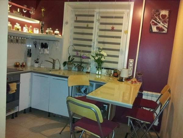 Чтобы сделать маленькую комнату в квартире более просторной, можно установить раздвижные двери на кухню либо же убрать их совсем, если у вас есть мощная вытяжка. Хорошо, если шторы на кухне будут светлыми и пропускающими лучи солнца: таким образом на кухне всегда будет светло и вы визуально увеличите пространство. Потолок также должен быть в светлых тонах, а люстру лучше повесить одну, но большую. Стены и мебель не должны быть темными, ведь в противном случае кухня будет казаться маленькой. Очень хорошо дополнит интерьер небольшой кухни фартук из стекла, ведь он будет не только украшать комнату, но и визуально расширять пространство.
