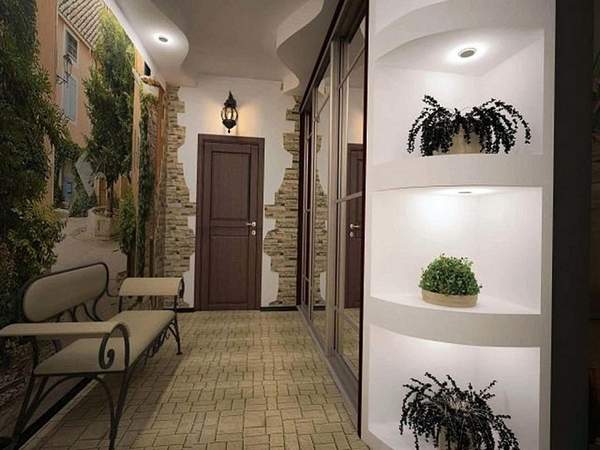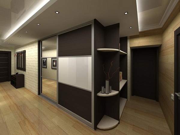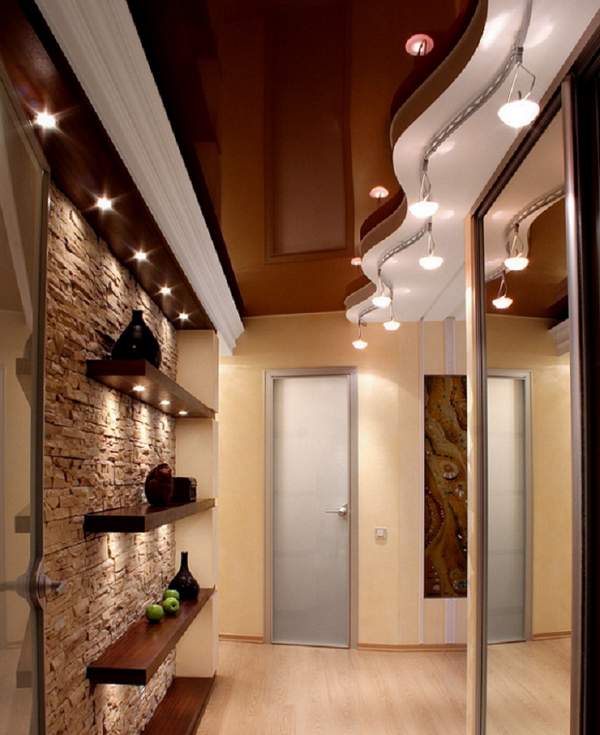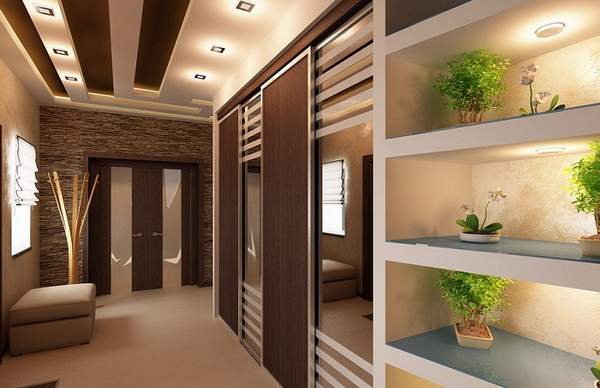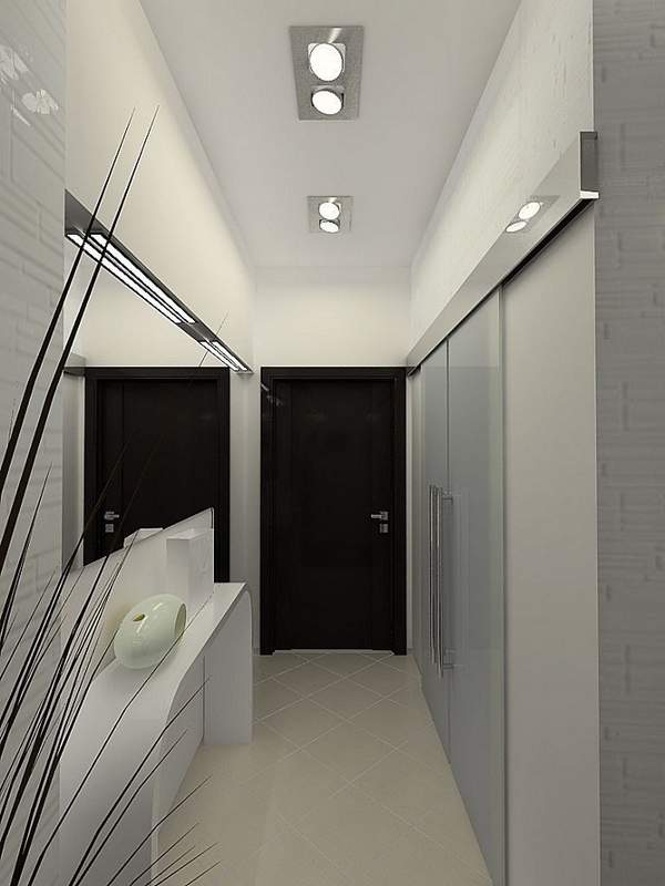 Продумывая заранее дизайн длинной прихожей в квартире (фото некоторых проектов нами представлены) лучше отказаться от подвесных потолков с подсветкой — такой вариант, безусловно, сделает зрительно потолочную поверхность выше, но при этом, еще больше сузит и без того небольшое пространство.