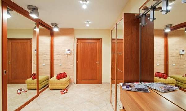 В качестве материалов можно использовать обои, декоративную штукатурку, модную на сегодняшний день, отделку декоративным камнем и прочие. Необходимо учитывать, что главная задача для узкой и длинной прихожей — расширить пространство. Поэтому, если материал отделки предполагает наличие рисунка или узоров, лучше, чтобы они были расположены в горизонтальной плоскости. В значительной мере повлиять на интерьер прихожей в квартире могут фотообои. Расположив их, например, в конце длинного коридора на глухой стене, можно получить эффект продолжительности пространства, а если разместить фрагменты фотообоев на боковых стенах — визуально площадь значительно расширится. Также хорошо способны увеличить площадь зеркала, размещенные на стенах или на раздвижных дверях шкафа-купе.
