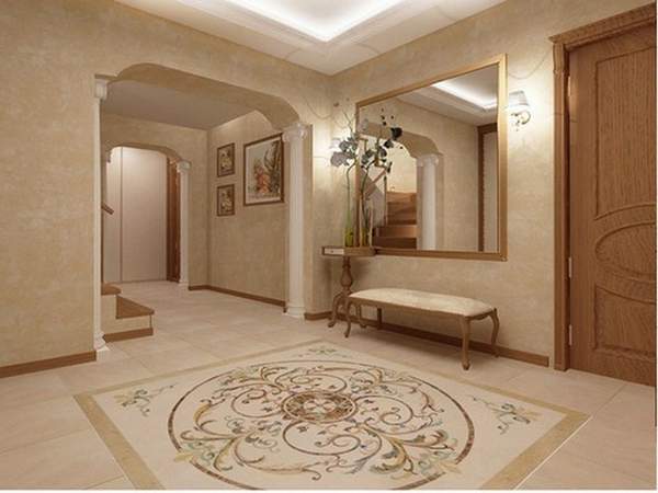 Интерьер прихожей в квартире с большой площадью может предусматривать различные комбинации напольных покрытий из прочного материала, например, керамическая плитка возле входа и ламинат в коридоре.