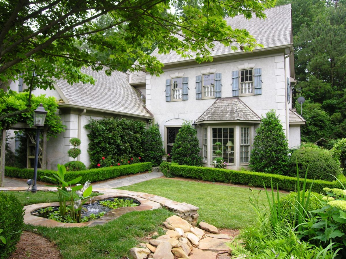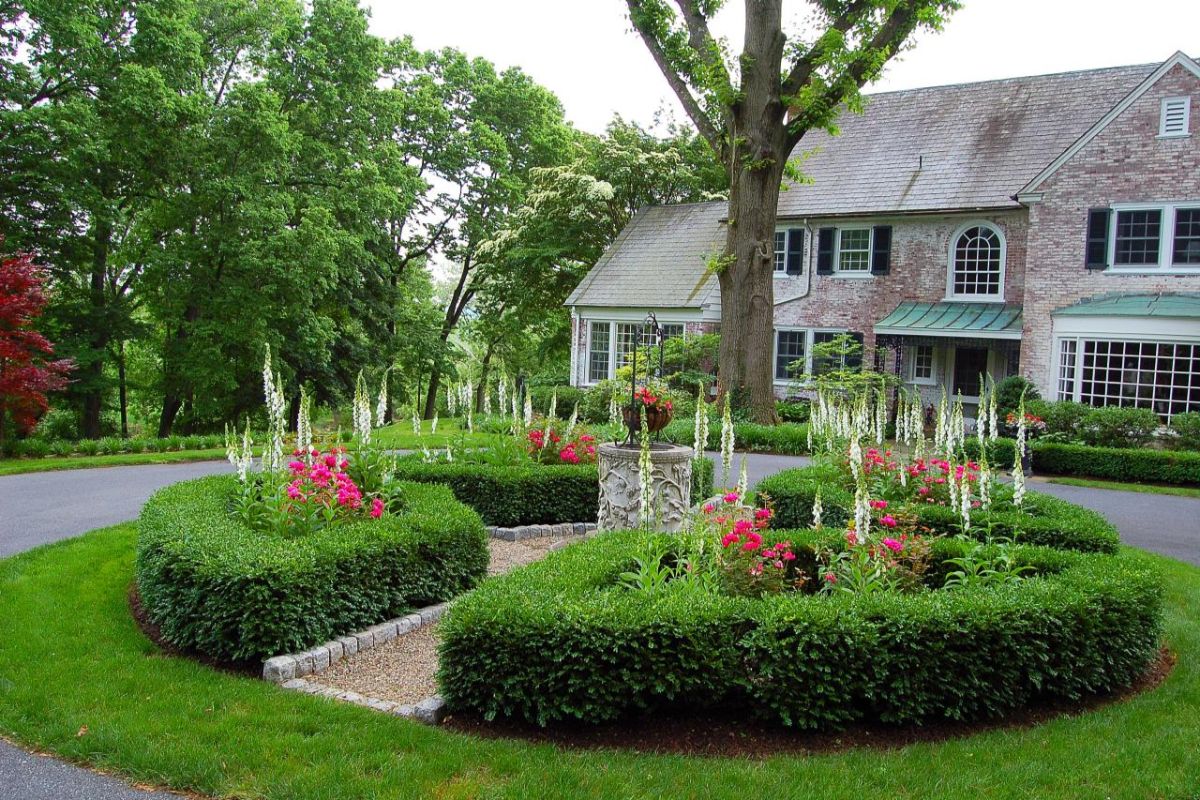Для большого дома из камня нужно подобрать соответствующее обрамление. Если территория просторная, им может стать садовый участок во французском стиле. К характерным чертам такого дизайна можно отнести: