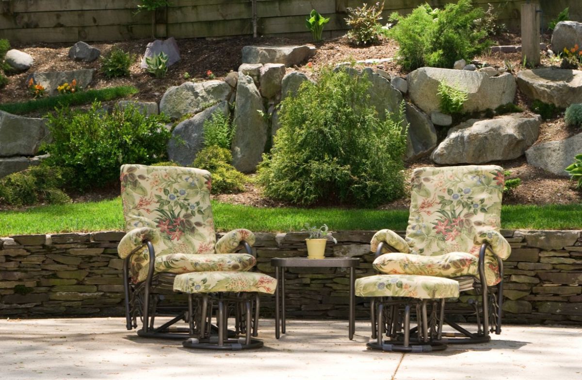 В зоне релакса можно обустроить деревянный настил, поставить кованую или плетеную садовую мебель с разноцветными подушками. Будут уместны объемные вазы с цветами, небольшие скульптурные элементы. Идеально, если получится дополнить картину фонтаном.