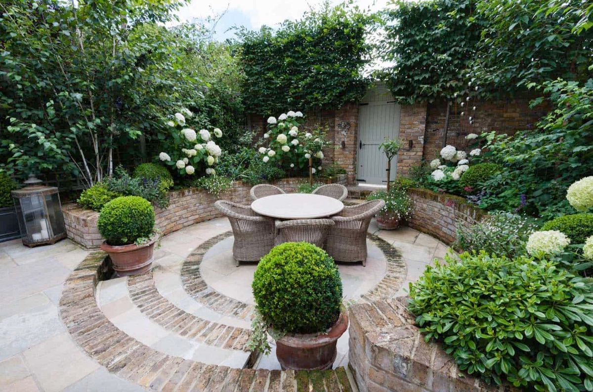 Если ваш дом образует патио, смело выбирайте средиземноморский стиль для обустройства садового участка на прилегающей территории. Особенностью данного направления является использование в оформлении природного камня, морской гальки. Допускается наличие кирпичной стены, которая покрыта вьющейся растительностью.