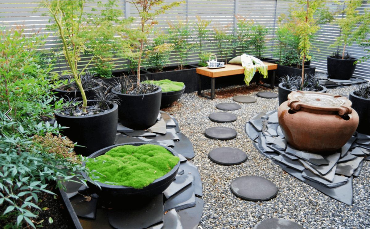 Отличительные черты ландшафтного дизайна в японском стиле — это водоемы, черепичная крыша на аккуратной беседке, карликовые деревья. Дорожки садового участка можно усыпать гравием.
