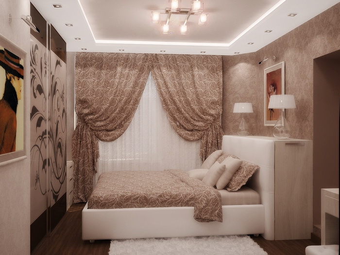 Тюль светлых оттенков придаст объемный вид маленькой комнате. Портьеры могут быть бежевые, персиковые или светло-коричневые. Комната станет зрительно больше и светлее.