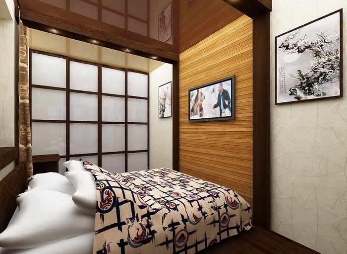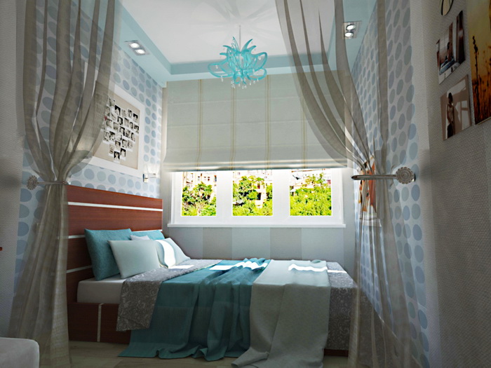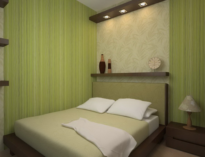 Для узкой спальни желательно выбирать обои светлых тонов. Например, бежевые, светло-персиковые, салатовые или других постельных цветов. Лучше приобрести обои в горизонтальную полоску.