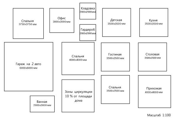 3. Набросок схемы размещения комнат. После создания спецификации вы уже можете подсчитать примерные размеры помещений — их длину и ширину. Исходя их этих данных, начертите дизайн частного дома своими руками — схему размещения комнат в доме относительно друг друга. Для большей уверенности в цифрах используйте рулетку, чтобы измерить размеры пространств и предметов в существующем доме. Также запишите, что еще около 10% площади дома уйдет на так называемые «зоны циркуляции», т. е. переходы между комнатами и другие пространства, которые трудно учесть сразу.