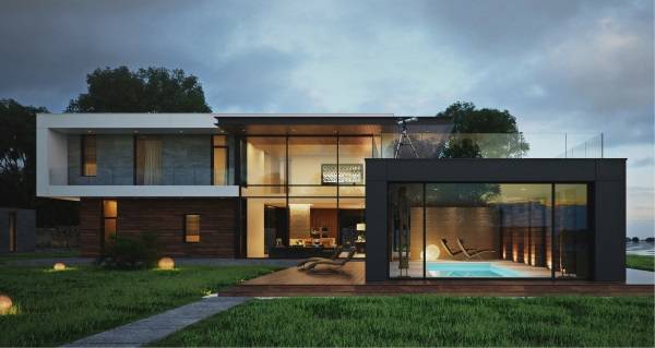 Для строительства дома в стиле хай тек используют передовые технологии и материалы: бетонные и сип-панели, солнечные батареи, системы «умный дом» и пр. В то же время, дизайн фасада может удивлять своими сложными геометрическими формами, нестандартными пропорциями, большими окнами и индустриальной эстетикой (неприкрытые трубы, стены из разных материалов, металл).
