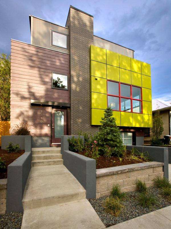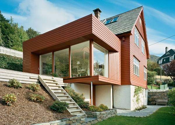 - Простой минималистский декор фасада — сайдинг, вагонка, панели, деревянные решетки, перила с рейлингами;
