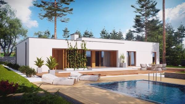 - Плоские крыши, располагающиеся как под прямым, так и под острым углом относительно стен. Прямые плоские крыши часто оборудуются под площадку для отдыха с бассейном или кострищем.