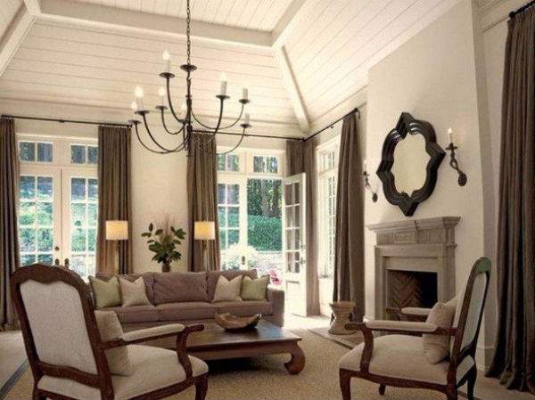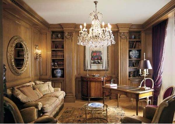 Обязательным элементом интерьера дома в английском стиле спокойно можно назвать красное дерево. Дорогой и элегантный материал, отлично подойдет для мебели и внутренней отделки комнаты. Однотонные стены по традиции украшают картинами или гобеленами. Окна играют особую роль, их обязательно завешивают богатыми многослойными шторами, украшенными вуалями, драпировками и шнуровками.